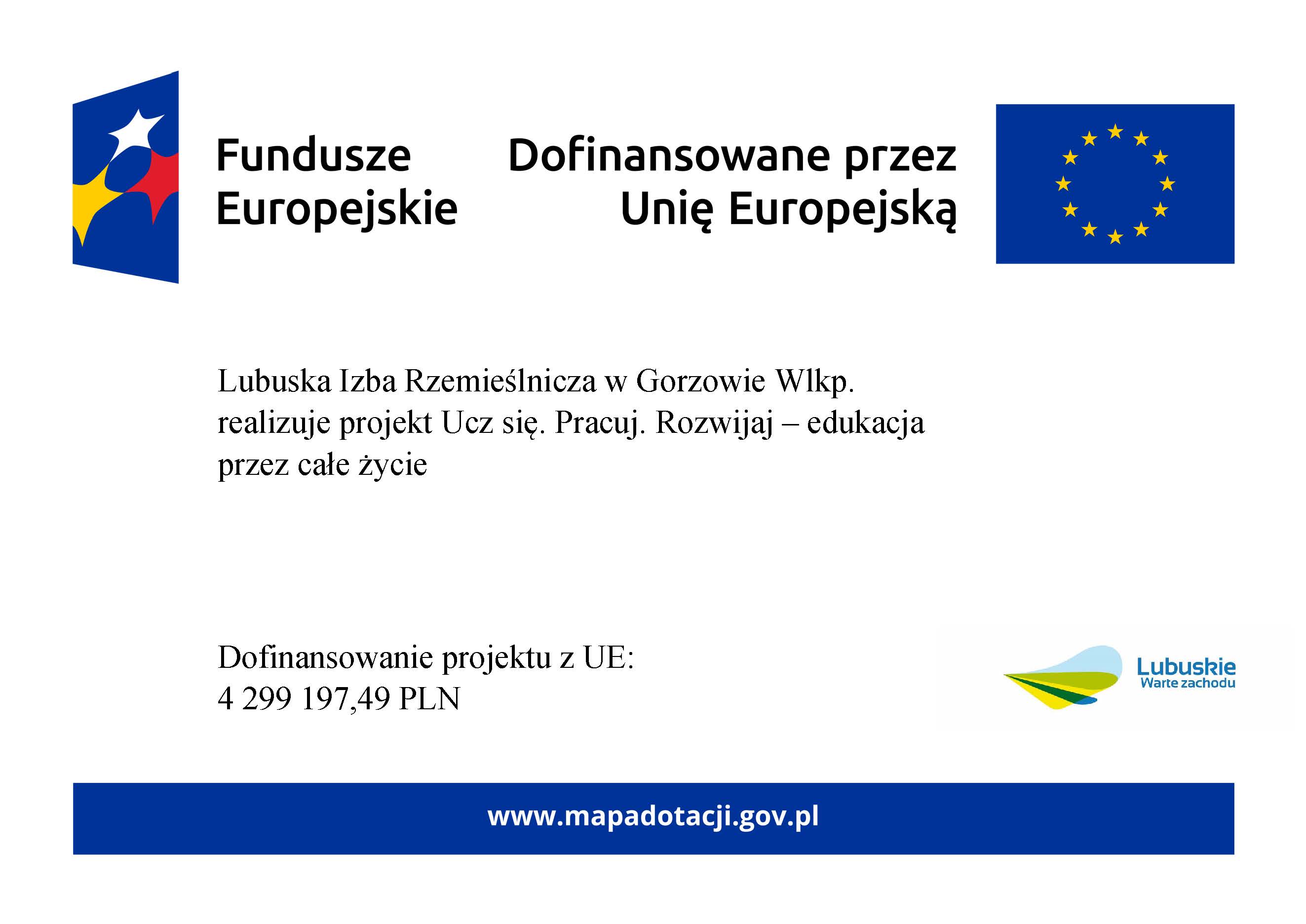 Od dnia 1 lutego 2026 roku Lubuska Izba Rzemieślnicza w Gorzowie Wlkp. realizuje projekt pn. „Ucz się. Pracuj. Rozwijaj – edukacja przez całe życie”, który jest współfinansowany z Europejskiego Funduszu Społecznego Plus, w ramach Programu Fundusze Europejskie dla Lubuskiego 2021 – 2027, Priorytetu 6. Fundusze Europejskie na wsparcie obywateli, Działania 6.8 Edukacja dorosłych.